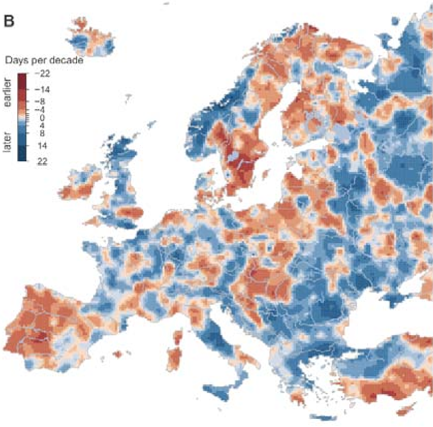 Bild 14 [x] Supplement, Fig. S3 (Teilbild) 7-day maximum precipitation (1960-2010), trend in timing; red indicates earlier precipitation, blue later precipitation (days per decade) (B).