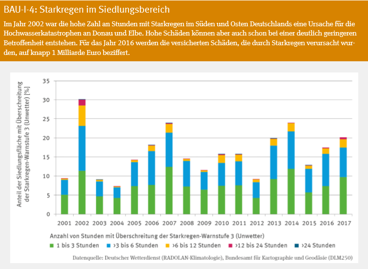 Für Deutschland sagt der Klima-Monitoringbericht 2019: Starkregen im Siedlungsbereich: Ein Trend ist nicht ermittelbar