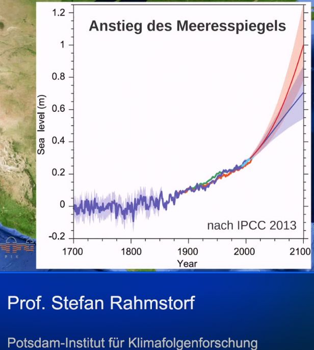 In einem Vortrag zum Klimawandel darf der Meerespegel nie fehlen. So hält es auch Prof. Rahmstorf, zeigt (unter anderem) das folgende Bild und sagt: