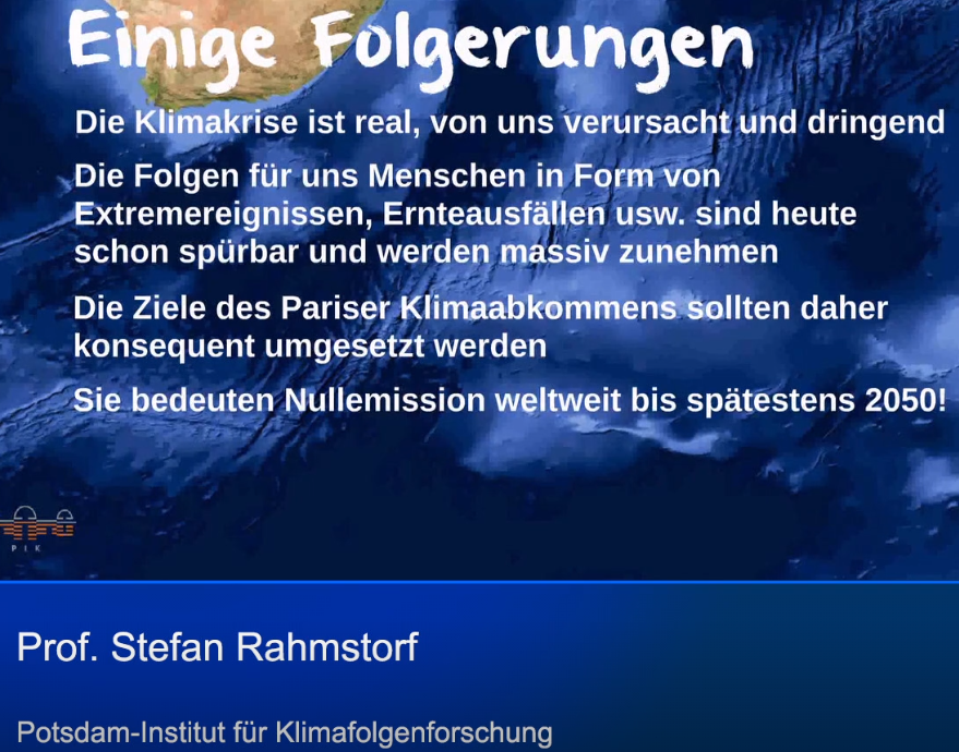 Am Mittwoch, den 13. November 2020, besuchte eine Gruppe interessierter Schülerinnen und Schüler aus der Q11 den Vortrag „Menschheit in der Klimakrise – Die wichtigsten Daten und Fakten“ von Prof. Dr. Stefan Rahmstorf vom Potsdam-Institut für Klimafolgenforschung an der FAU Erlangen.
