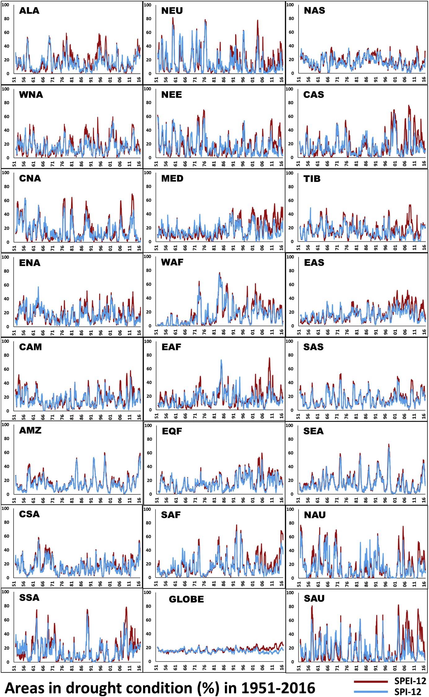Bild 39 [8] Fig. 8. Percentage of areas in drought conditions from 1951 to 2016 according to the SPI-12 (blue) and to the SPEI-12 (red) for 23 macro-regions and at global level. For the list of the acronyms, see Table 1. (For interpretation of the references to colour in this figure legend, the reader is referred to the web version of this article.)