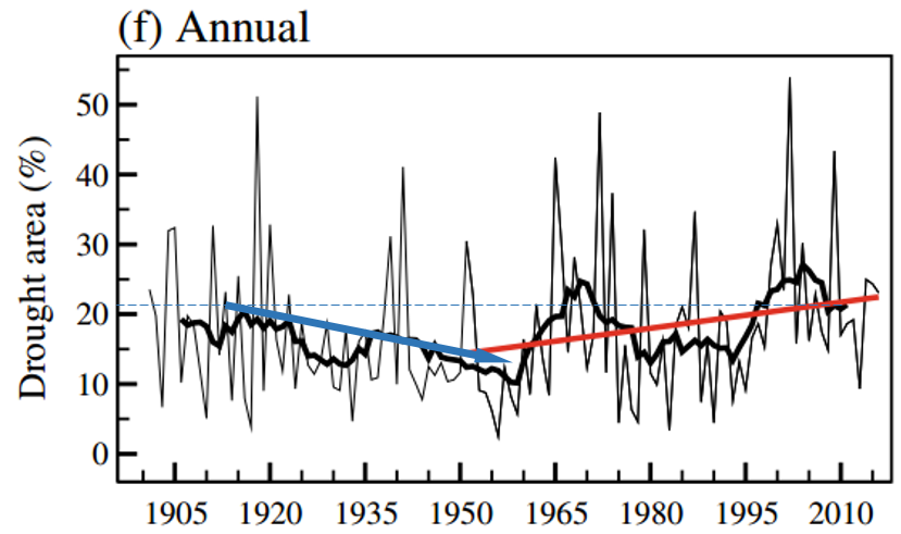 Aus einer anderen Studie weltweit die Dürreflächen seit 1951. Auch darin lässt sich mit Sicherheit kein vorhandener Trend zu mehr Dürren ableiten.