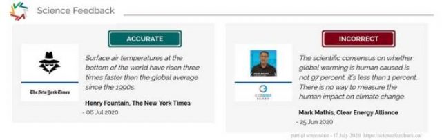 Wer hat das getan? Climate Feedback. Sie sind nicht auf der Facebook-Liste der anerkannten Faktenprüfer aufgeführt (siehe diese Site, unten, wählen Sie, um die Liste der US-amerikanischen Faktenprüfer zu sehen), aber sie sind offenbar eine Untergruppe von Science Feedback, die aufgeführt ist.