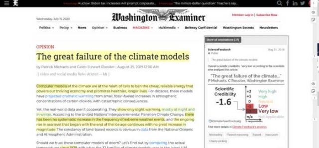 3. Anscheinend können sie den Washington Examiner nicht unter Druck setzen, also gehen sie dem wiederveröffentlichten Artikel auf der Facebook-Seite der Koalition nach, führen ihre unabhängige und unaufgeforderte „Faktenprüfung“ durch und bezeichnen den Meinungsartikel auf Facebook als „irreführend, fehlerhaft argumentiert, voreingenommen, ungenau und als Rosinenpickerei“. Man beachte, dass alle ihre Einwände selbst Meinungen und ihr eigenes Verständnis komplexer Daten sind – wenn auch in Übereinstimmung mit dem, was als „Klimakonsens“ bezeichnet wird.
