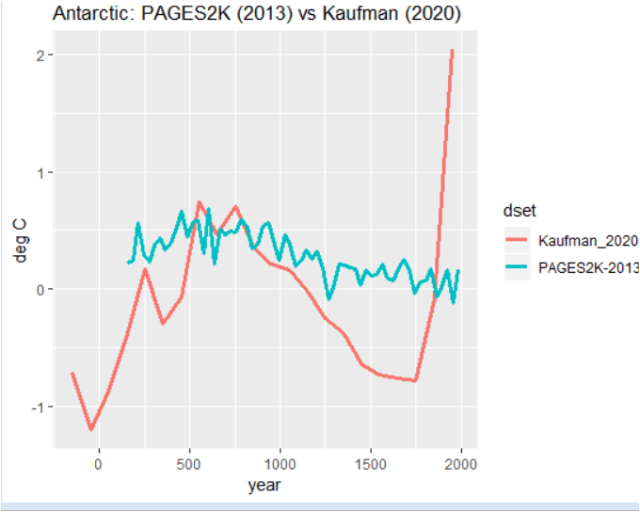 13: Ich habe nicht auf andere Regionen geschaut, aber Kaufmans Rekonstruktion der Antarktis ist ein Chaos und muss zurückgezogen werden. Man erinnert sich vielleicht daran, dass Kaufmans arktische PAGES2K-Serie in Island und Grönland, die ähnlich verunreinigt waren, in ähnlicher Weise auf den Kopf gestellt wurde.