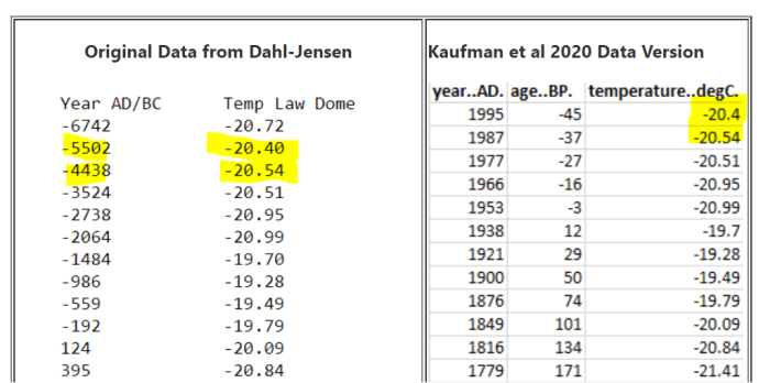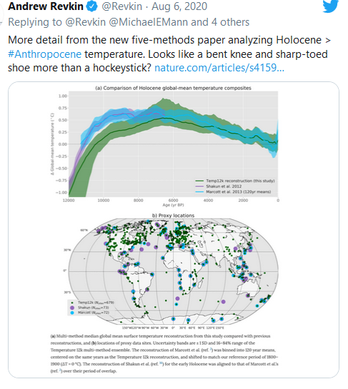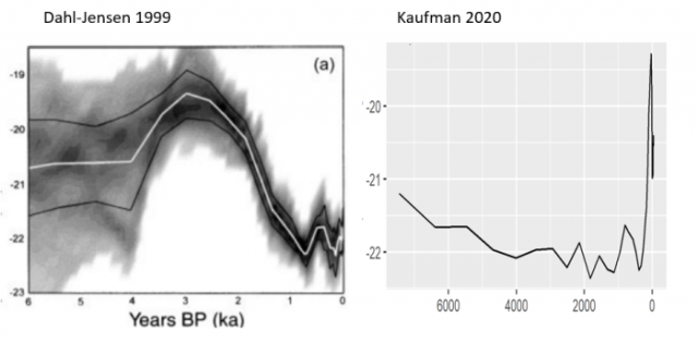 4: Es war leicht zu bemerken. Ich habe dies innerhalb eines Tages oder so nach der Veröffentlichung getwittert. Es gibt zwei weitere sehr fragwürdige „neue“ Serien. Anstatt die neue WAIS-Isotopenserie – die höchstauflösende antarktische Serie über das Holozän – zu verwenden, zogen sie eine WAIS-Bohrloch-Umkehrung heran.