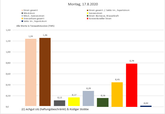 Montag, 17.8.2020: Anteil erneuerbare Energieträger an der Gesamtstromerzeugung 36,29 Prozent, davon Windstrom 9,68 Prozent, Sonnenstrom 13,71 Prozent, Strom Biomasse/Wasserkraft 12,90 Prozent. Die Agora-Chartmatrix: Hier klicken.