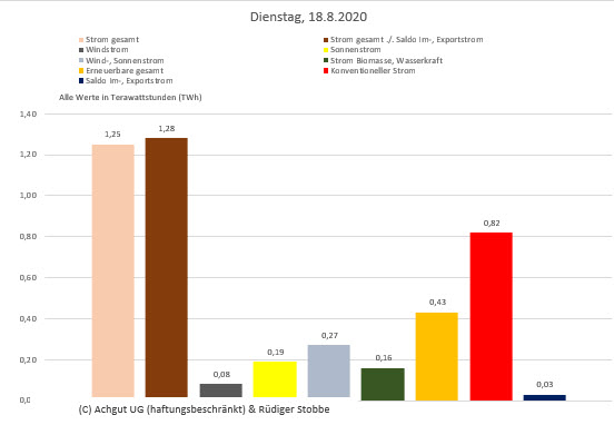 Dienstag, 18.8.2020: Anteil erneuerbare Energieträger an der Gesamtstromerzeugung 34,29 Prozent, davon Windstrom 6,40 Prozent, Sonnenstrom 15,20 Prozent, Strom Biomasse/Wasserkraft 12,80 Prozent. Die Agora-Chartmatrix: Hier klicken.