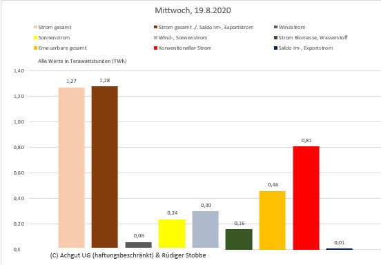 Mittwoch, 19.8.2020: Anteil erneuerbare Energieträger an der Gesamtstromerzeugung Über WordPress 36,22 Prozent, davon Windstrom 4,72 Prozent, Sonnenstrom 18,90 Prozent, Strom Biomasse/Wasserkraft 12,6 Prozent. Die Agora-Chartmatrix: Hier klicken.