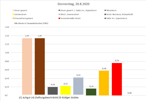 Donnerstag, 20.8.2020: Anteil erneuerbare Energieträger an der Gesamtstromerzeugung 43,28 Prozent, davon Windstrom 14,93 Prozent, Sonnenstrom 16,42 Prozent, Strom Biomasse/Wasserkraft 11,94 Prozent. Die Agora-Chartmatrix: Hier klicken.