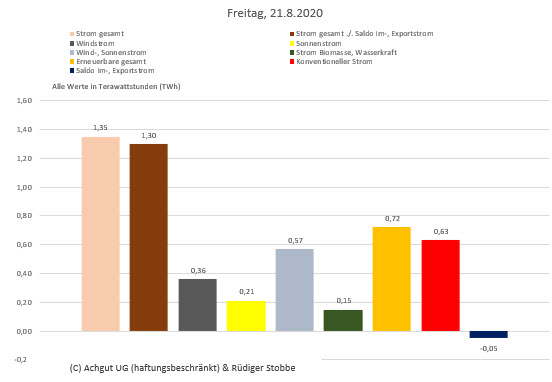 Freitag, 21.8.2020: Anteil erneuerbare Energieträger an der Gesamtstromerzeugung 53,33 Prozent, davon Windstrom 26,67 Prozent, Sonnenstrom 15,56 Prozent, Strom Biomasse/Wasserkraft 11,11 Prozent. Die Agora-Chartmatrix: Hier klicken.