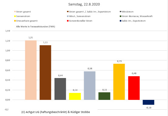 Samstag, 22.8.2020: Anteil Erneuerbare an der Gesamtstromerzeugung 60,33 Prozent, davon Windstrom 36,36 Prozent, Sonnenstrom 11,57 Prozent, Strom Biomasse/Wasserkraft 12,40 Prozent. Die Agora-Chartmatrix: Hier klicken.