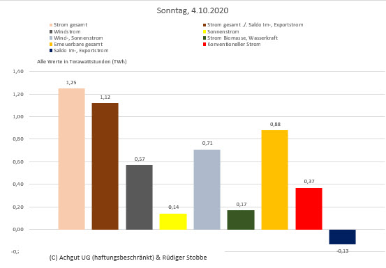 Sonntag, 4.10.2020: Anteil erneuerbare Energieträger an der Gesamtstromerzeugung 70,40 Prozent, davon Windstrom 45,60 Prozent, Sonnenstrom 11,20 Prozent, Strom Biomasse/Wasserkraft 13,60 Prozent. Die Agora-Chartmatrix: Hier klicken.