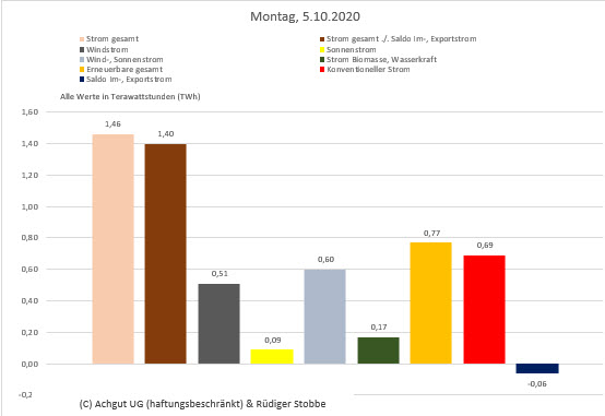 Montag, 5.10.2020: Anteil erneuerbare Energieträger an der Gesamtstromerzeugung 52,74 Prozent, davon Windstrom 34,93 Prozent, Sonnenstrom 6,16 Prozent, Strom Biomasse/Wasserkraft 11,64 Prozent. Die Agora-Chartmatrix: Hier klicken.