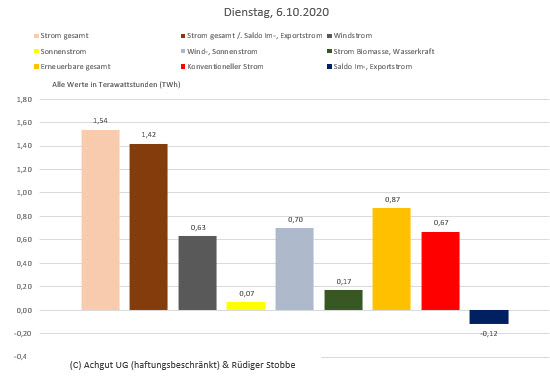 Dienstag, 6.10.2020: Anteil erneuerbare Energieträger an der Gesamtstromerzeugung 56,49 Prozent, davon Windstrom 40,91 Prozent, Sonnenstrom 4,55 Prozent, Strom Biomasse/Wasserkraft 11,04 Prozent. Die Agora-Chartmatrix: Hier klicken.