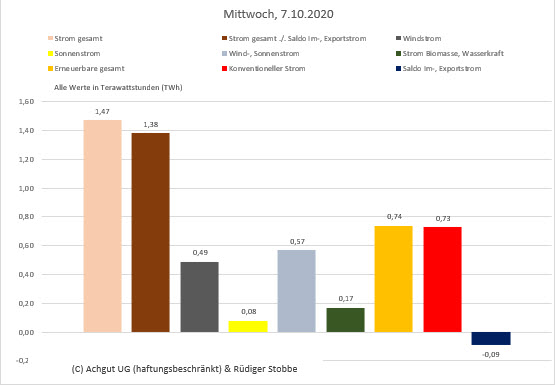 Mittwoch, 7.10.2020: Anteil erneuerbare Energieträger an der Gesamtstromerzeugung 50,34 Prozent, davon Windstrom 33,33 Prozent, Sonnenstrom 5,44 Prozent, Strom Biomasse/Wasserkraft 11,56 Prozent. Die Agora-Chartmatrix: Hier klicken.