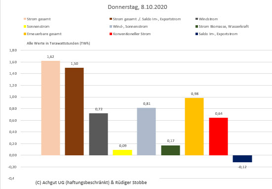Donnerstag, 8.10.2020: Anteil erneuerbare Energieträger an der Gesamtstromerzeugung 60,49 Prozent, davon Windstrom 44,44 Prozent, Sonnenstrom 5,56 Prozent, Strom Biomasse/Wasserkraft 10,49 Prozent. Die Agora-Chartmatrix: Hier klicken.