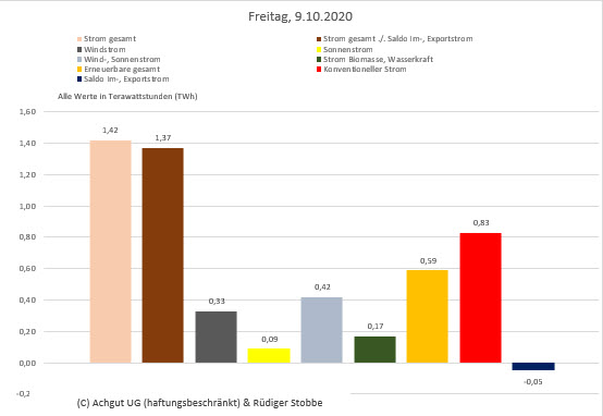 Freitag, 9.10.2020: Anteil erneuerbare Energieträger an der Gesamtstromerzeugung 41,55 Prozent, davon Windstrom 23,24 Prozent, Sonnenstrom 6,34 Prozent, Strom Biomasse/Wasserkraft 11,97 Prozent. Die Agora-Chartmatrix: Hier klicken