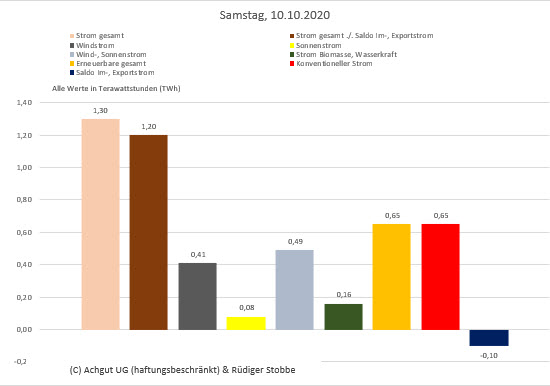 Samstag, 10.10.2020: Anteil Erneuerbare an der Gesamtstromerzeugung 50,00 Prozent, davon Windstrom 31,54 Prozent, Sonnenstrom 6,15 Prozent, Strom Biomasse/Wasserkraft 12,31 Prozent. Die Agora-Chartmatrix: Hier klicken.