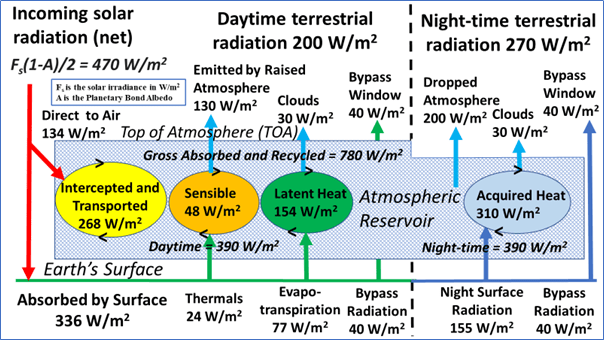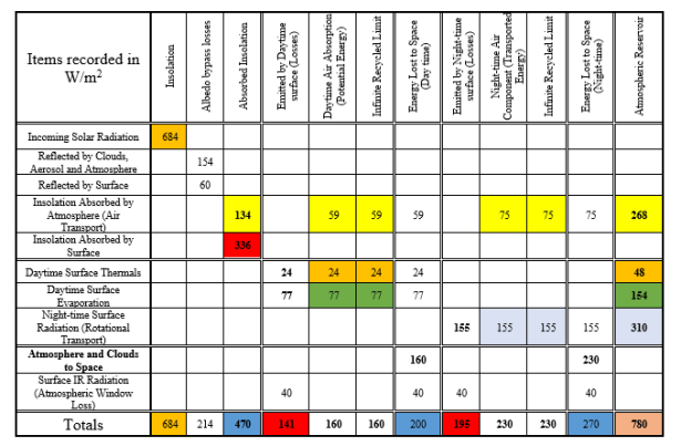 Zwischen diesen beiden geometrischen Beziehungen der Einstrahlung und der Ausstrahlung zurück in den Weltraum liegt das atmosphärische Reservoir, die gasförmige Hülle der Erde, in der alle Klimaprozesse ablaufen. Die folgende Tabelle und Abbildung, die aus dem kanonischen Modell von Kiehl und Trenberth (1997) übernommen wurden, dienen der Veranschaulichung eines Modells, in dem die grundlegenden Realitäten einer beleuchteten (Tag) also Hell- und unbeleuchteten (Nacht) Halbkugel als irreduzibles logisches geometrisches Minimum für den Energiehaushalt des Erdklimas beibehalten werden.