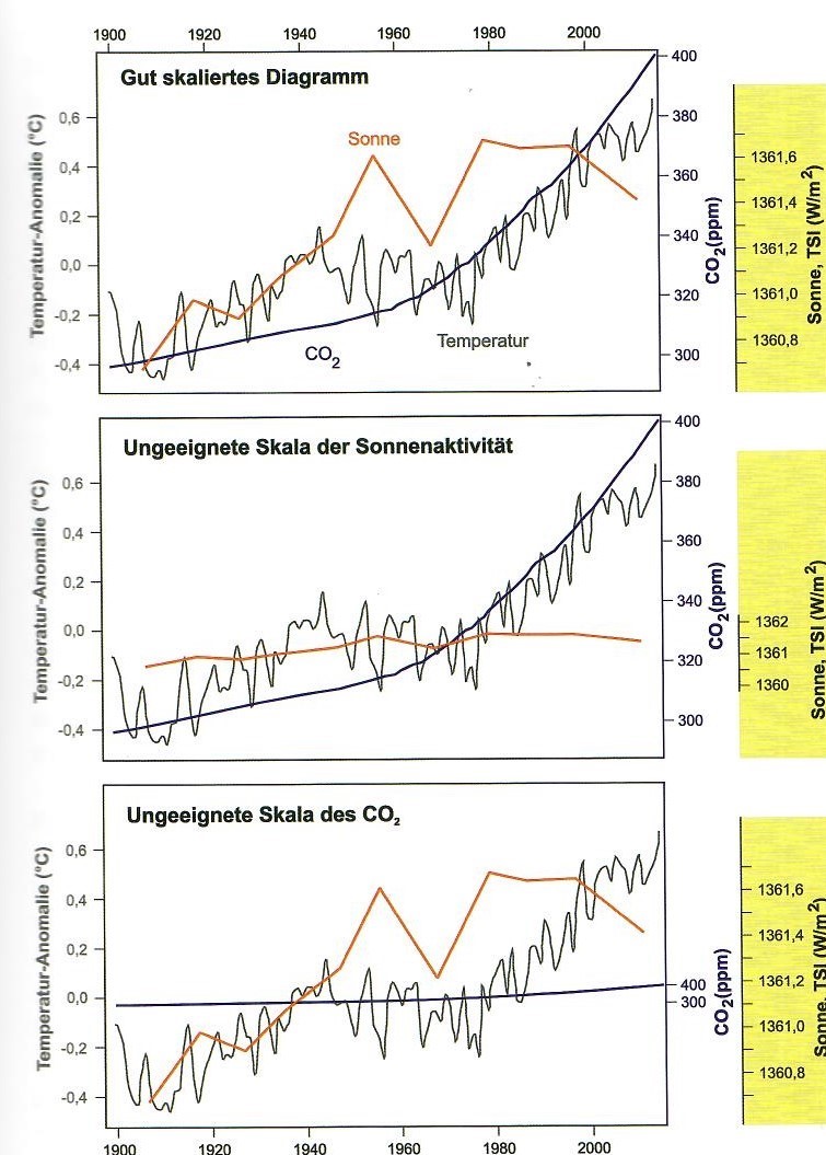 Dieser „Trick“, der eines Wissenschaftlers unwürdig ist, wird in der nachfolgenden Abbildung 2 entlarvt. Sie entspricht der Abbildung 14 aus dem Buch „Unerwünschte Wahrheiten“ von Fritz Vahrenholt und Sebastian Lüning (9) und zeigt beispielhaft, wie man durch Dehnung oder Stauchung der Skala den jeweils gewünschten Eindruck erwecken kann. Das gut skalierte Diagramm (obere Grafik der Abbildung 2) zeigt den Anstieg der Sonnenaktivität (rote Kurve) von 1910 bis etwa 1955, der mit einem Anstieg der globalen Temperatur (graue Kurve) einherging. Danach verringerte sich die Aktivität der Sonne bis 1965, was mit einem Abfall der globalen Temperaturen einherging. Danach stieg die Sonnenaktivität bis 1980 wieder an und blieb bis 1995 auf diesem erhöhten Niveau. Parallel hierzu stieg auch die globale Temperatur an.