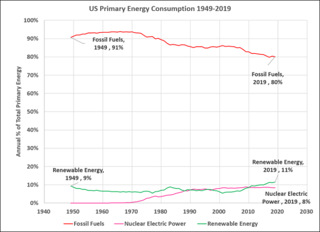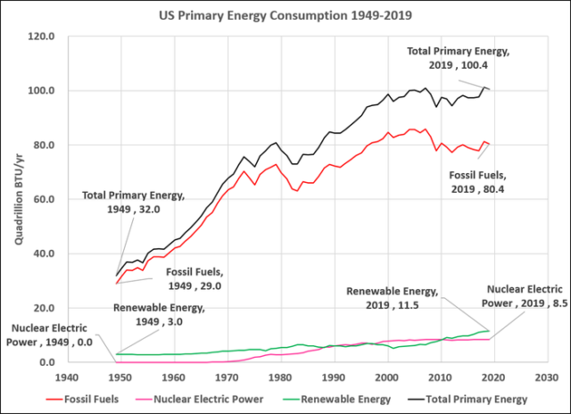 1949 stammten 9% unseres Primärenergieverbrauchs aus realer erneuerbarer Energie (Wasserkraft). Im Jahr 2019 ist der Anteil aufgrund massiver „Investitionen“ in „erneuerbare Energien“ (hauptsächlich Wind & Solar) nur auf 11% gestiegen. Im gleichen Zeitraum ist der Anteil fossiler Brennstoffe nur von 91% auf 80% gesunken, wobei der größte Teil auf das Wachstum der Kernenergieerzeugung von 1970-1990 zurückzuführen ist.