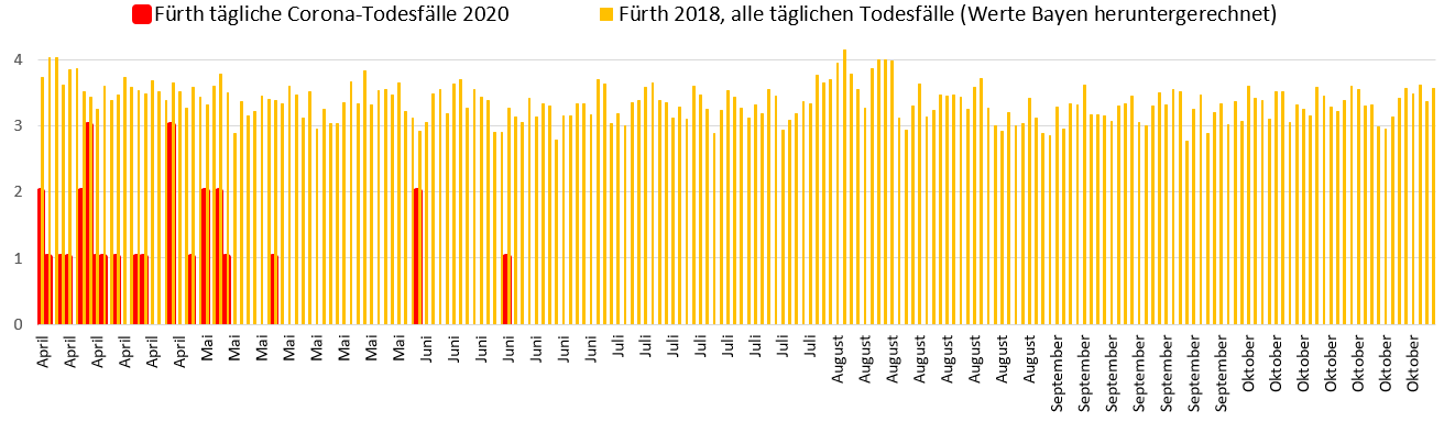 Bild 3 Tägliche Fallzahlen Fürth: Corona-Todesfälle, alle Todesfälle (aus dem Werte Bayern 2018 auf Fürth heruntergerechnet). Grafik vom Autor erstellt. Datenquelle: corona-fallzahlen.landkreis-fuerth.de