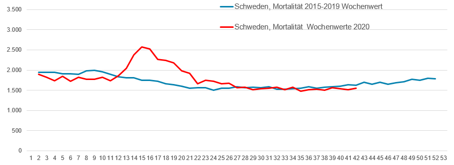 Für Schweden sieht man deutlich, dass die relative Mortalität im Frühjahr erheblich höher war, dann jedoch trotz der vielen, nicht vorgenommenen Restriktionen und ohne Zerstörung ganzer Wirtschaftszweige und des öffentlichen Lebens sogar relativ niedriger als in Deutschland verläuft.