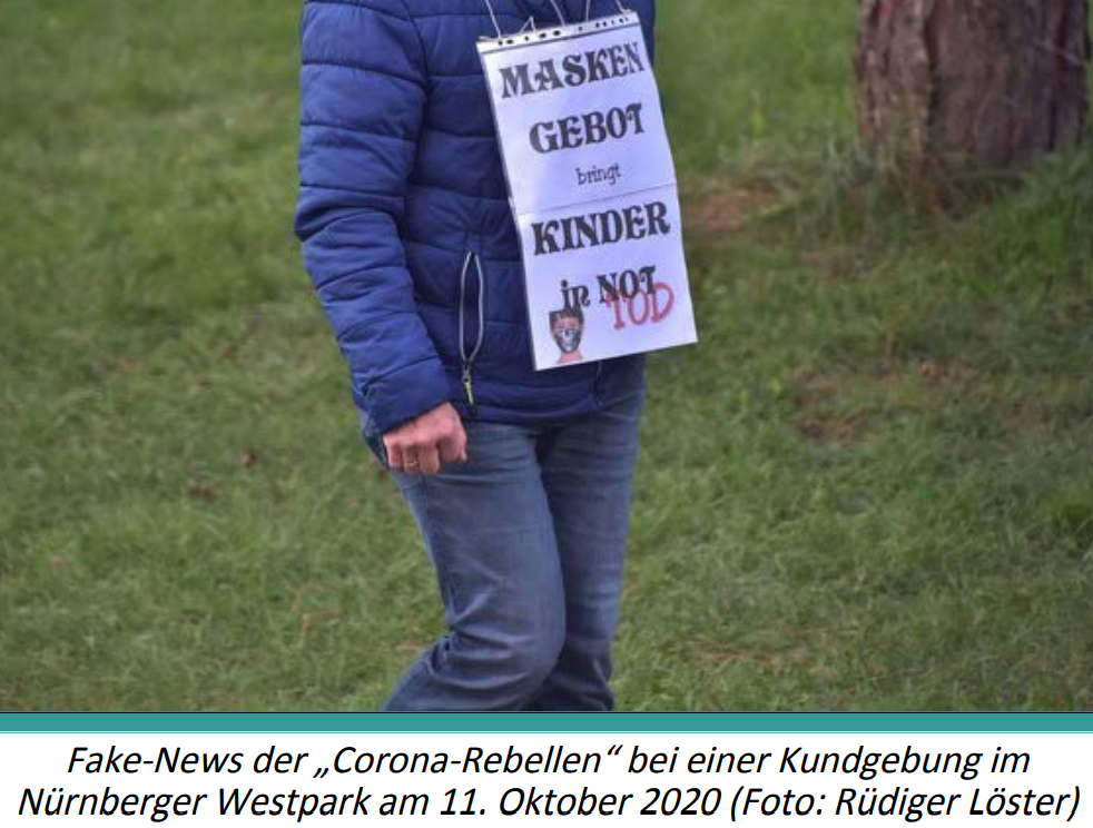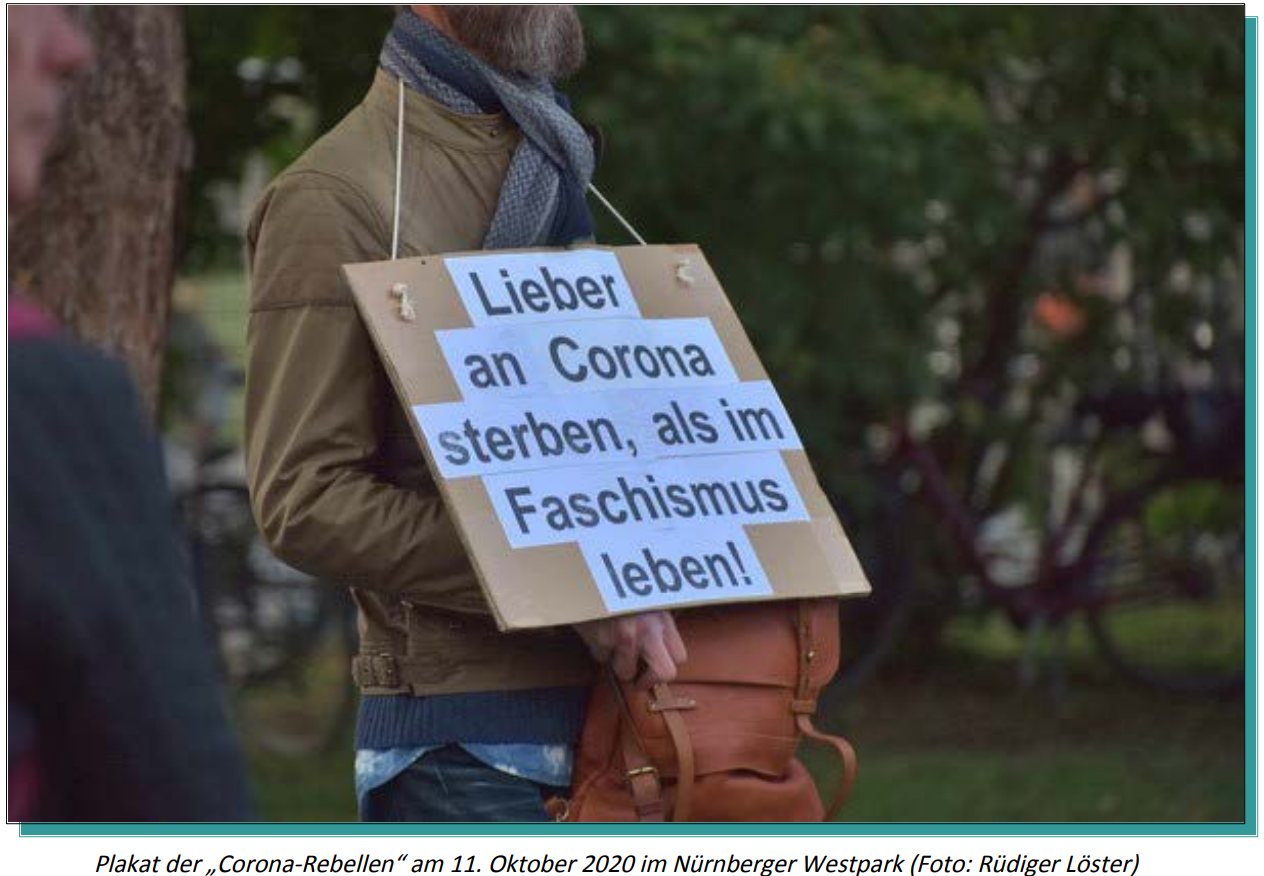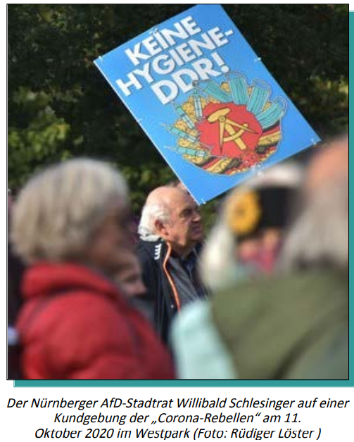 Mittlerweile haben sich die „Verfolger des immerwährenden Räääächts“ ebenfalls darauf spezialisiert. Ein im Wesentlichen von einem sich als moderne Blockwartversion aufführendem Verdi-Funktionär geführter Verein „Nürnberger Bündnis Nazistopp“ erstellte ein Dossier über die schlimmen Umtriebe der Coronazweifler „Mit Nazis gegen den vermeintlichen Faschismus? Die „Corona-Rebellen“ Nürnberg: Rechtsoffen, unsolidarisch und wissenschaftsfeindlich“. Was darin angeprangert wird, ist im Wesentlichen hanebüchen banal (Bildunterschrift im Zeitungsartikel: Aus Platzgründen wurden Treffen von Kritikern der Maßnahmen zur Corona-Bekämpfung nur noch an Orten wie der Wöhrder Wiese genehmigt – wo die Teilnehmer aber oft auch keine Abstände wahrten) und nicht entfernt mit dem Hass und Hetzte Linker Seiten zu vergleichen. Es erinnert beim Lesen deshalb stark an Dossiers der Stasi.