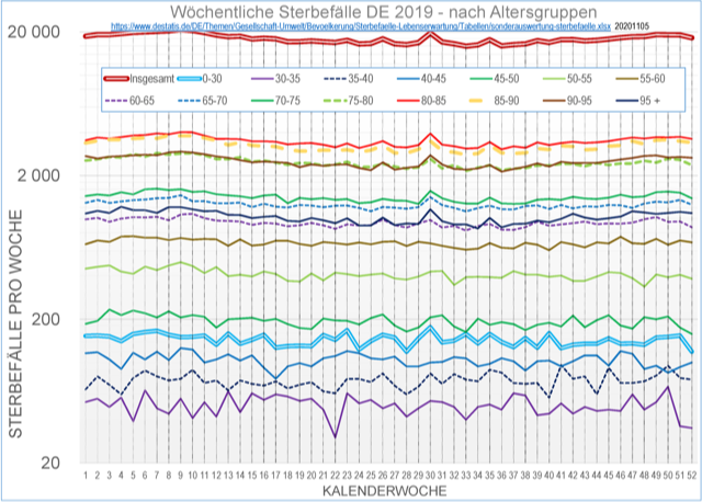 Im Vergleich mit den wöchentlichen Sterberaten im Vorjahr, 2019 (Abbildung 2), stellt sich 2020 bisher als völlig normales Jahr heraus. Die Spätwinter Sterblichkeit trat in 2019 etwas früher mit jahreszeitlich, kältebedingter erhöhter Sterblichkeit in den vier KWn 7 bis 10 (zwischen 10. Februar bis 8 März) auf, mit wöchentlich höheren Todesfällen von 20150, 20349, 20790, und 20453. Dieser Peak trat 2020 in schwächerer Form, vier Wochen verspätet und verkürzt zwischen dem 30. März und dem 12. April auf (siehe oben). Wo haben sich dann hier die Corona Toten versteckt?
