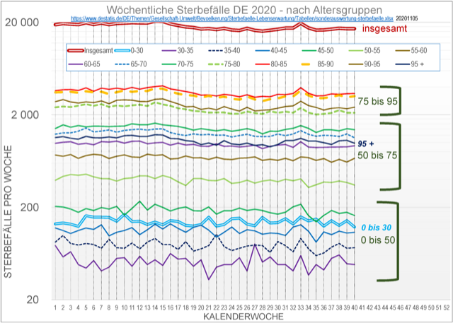 Angestoßen durch die neuen ‘Schutzmaßnahmen‘ ab November suchte ich nach Daten zu ‘harten‘ Endpunkten im Gegensatz zu den von den Medien verbreiteten PCR-Testergebnissen, die sinn- und rechtswidrig als Infektions-„Fälle“ den verängstigten Konsumenten um die Ohren geschlagen wurden und mit denen unsere Obrigkeit ihre Zwangsmaßnahmen zu rechtfertigen sucht. Dr. med. Gunter Frank hatte (hier) solche „harten Endpunkte“ diskutiert. Unbestreitbar die härteste aller denkbaren Gesundheitsdaten stellen die Todesfallraten dar. Stephan Kloss hatte (hier) verwiesen auf die amtlichen (DeStatis) deutschen Sterbedaten für die Jahre 2016 bis 2020 (bis einschließlich September).