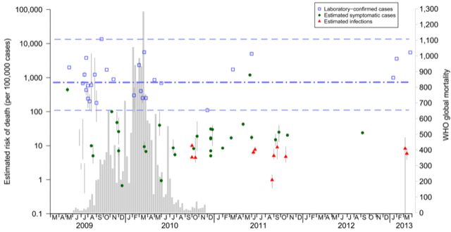 Neben dem Vergleich der Sterblichkeitsraten der Jahre 2019 und 2020 drängt sich der Vergleich mit Sterblichkeitsraten in anderen Pandemien auf, insbesondere in den ‘gewohnten‘ Influenza Pandemien. Abbildung 3 präsentiert die in verschiedenen Regionen und im zeitlichen Verlauf beobachteten Fall-Mortalitätsraten einer eher schwereren Influenza-A Pandemie von 2009. Neben ‘weichen‘ Schätzungen auf Grund von „geschätzten Infektionen“ oder „symptomatischen Fällen“ zeigen die ‘harten‘ Schätzungen auf der Basis von labortechnisch nachgewiesenen Infektionen eine Schwankungsbreite von mehr als zwei Größenordnungen mit im ‘Mittel‘ ca. 0.8 % Mortalität. Aktuelle Schätzungen der Fall-Mortalitätsraten für Covid-19 konvergieren zunehmend in einen Bereich, der sich nur unwesentlich von diesem Influenza-A Wert abhebt – wenn überhaupt. Somit ist die Covid-19 Pandemie auch hinsichtlich dieses „harten“ Endpunkts inzwischen ein eher normales Ereignis. Anomal sind nur die Reaktionen der vorgeblichen Lebensschützer (für die mehrheitlich menschliches Leben im Mutterleib ein zu beseitigender Störfaktor ist). Wer 2009/2010 einen Lockdown mit der Begründung hätte durchsetzen wollen, er wolle Leben schützen, der wäre aus dem Amt gejagt worden.