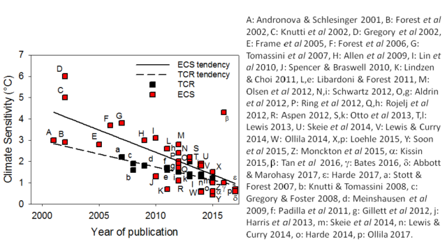 Die Ergebnisse aus der Arbeit von Wijnsgaard und Happer – hier speziell ihre Werte der Klimasensitivität in Table 5 auf S. 32 – fügen sich gut in die inzwischen berühmt gewordene Grafik von Francois Gervais ein, in welcher er die in Fachliteratur-Veröffentlichungen angegebenen Werte der Klimasensitivität gegen das jeweilige Erscheinungsdatum der betreffenden Veröffentlichungen aufgetragen hat [1].