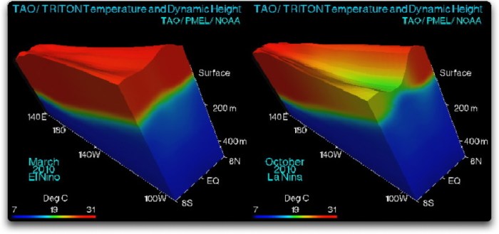 Abbildung 9: Die Nino/Nina-Unterschiede, wie sie durch die TAU/TRITON vertäuten Bojen entlang des Äquators gezeigt werden. Sie blicken nach Westen, über den Äquator im Pazifik, von einem Aussichtspunkt irgendwo in den Anden in Südamerika. Die farbigen Flächen zeigen die Meerestemperaturen von TAO/TRITON. Die obere Fläche ist die Meeresoberfläche, von 8°N bis 8°S und von 137°E bis 95°W. Die Form der Meeresoberfläche wird durch TAO/TRITON Dynamic Height-Daten bestimmt. Die breite vertikale Oberfläche liegt bei 8°S und erstreckt sich bis in 500 Meter Tiefe. Die schmalere vertikale Oberfläche befindet sich bei 95°W. Alle diese Daten stammen von der TAO/TRITON-Anordnung vertäuter Ozeanbojen im äquatorialen Pazifik.