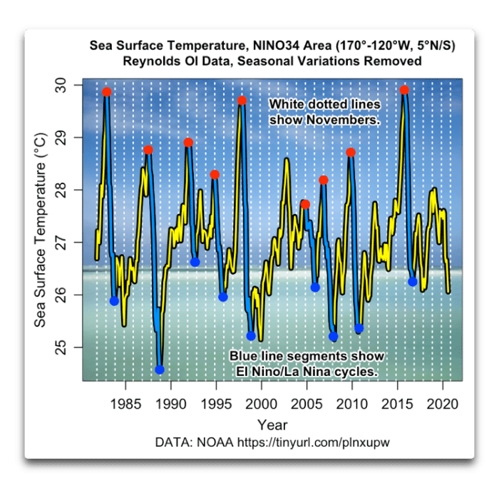 Abbildung 11. Meeresoberflächentemperatur im NINO34-Gebiet. Blaue Abschnitte zeigen die Zeiten, zu denen der Pumpvorgang stattfindet. Rote Punkte zeigen die Spitzenwerte der El Nino-Bedingungen und blaue Punkte die Spitzenwerte der La Nina-Bedingungen. Gepunktete vertikale weiße Linien zeigen den November eines jeden Jahres.