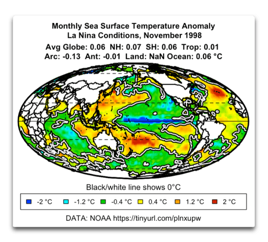 Und wie oben gezeigt, ist unten ein tatsächlicher La Nina-Zustand dargestellt. Dies ist der La Nina-Höhepunkt desselben Nino/Nina-Zyklus in Abbildung 5, der 12 Monate zuvor, im November 1997, begonnen hatte.