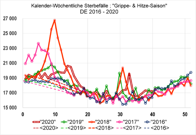 Im vorhergehenden Beitrag (hier) wurden die von DeStatis veröffentlichten Sterbefälle (hier) mit logarithmischer Skalierung der Y-Achsen präsentiert, weil nur so die Aufteilung der Sterblichkeit auf die verschiedenen Altersklassen optisch überhaupt erst sichtbar gemacht werden kann. Dem einen oder anderen Leser sowie Kommentator war die Interpretation dieser Kurven möglicherweise nicht geläufig. Abbildung 1 präsentiert jetzt die wöchentlichen Todesfälle der Jahre 2016 bis 2020 (2020 bis erste Oktoberwoche), und zwar diesmal nur die Todesfälle insgesamt in linearer Skalierung der Y-Achse. Die gestrichelten Geraden sind grobe Schätzungen des Verlaufs, den man erwarten würde, wenn die Sterblichkeit nur dem kalenderjährlichen Trend ohne die typischen winterlichen (meist) Virus bedingten Todesfälle verliefen und wie er auch während des Anstiegs in der zweiten Jahreshälfte in Erscheinung tritt.