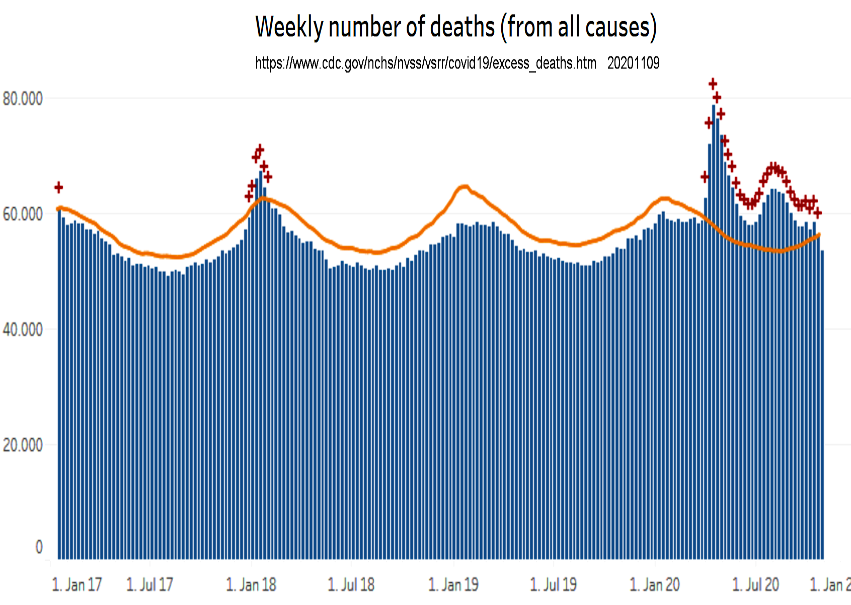 Abbildung 2: Wöchentliche Gesamtsterblichkeit in den U.S.A der Jahre 2017 bis 2020. Die gelbe Linie stellt die Basis dar für die Schätzung der Exzeß Sterblichkeit in den mit roten „+“-Zeichen markierten Epidemien. Der markante Überschuß in 2020 wird der Covid-19 Epidemie zugeordnet. (Graphik modifiziert aus dieser Quelle [8. 11. 2020])