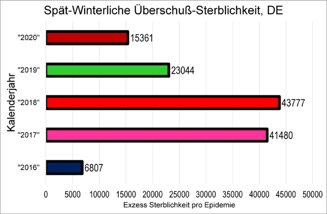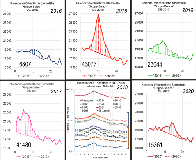 Ungeachtet der erheblichen Fehlerbreite dieser Schätzung lässt sich eine klare Rangfolge der Jahre anhand Zahl der Todesopfer aufstellen, die in den vergangenen fünf winterlichen ‘Grippe-Wellen‘ einem Virus zum Opfer fielen. Vor 2020 waren das keine SARS-CoV-2 Viren! Daß ausgerechnet in 2020 Influenza Viren völlig unbeteiligt gewesen sein sollen, das ist im übrigen sehr fraglich. Insofern sind unter den 15.361 Toten in Frühjahr 2020 sicher einige (wenige) Tausend der üblichen Influenza Opfer zu vermuten. Die Zahl dieser bisherigen Todesopfer des Jahres 2020 entspricht – gemessen an den Jahren 2019, 2018 und 2017 – nicht nur die Anzahl eines absolut (stink-) normalen oder durchschnittlichen Jahres. Die Zahl der Nicht-Covid-19 Toten der anderen drei Jahre übertraf sie deutlich um Faktoren, um bis zu beinahe einem Faktor 3.