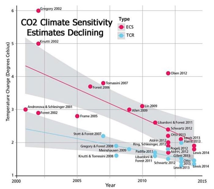 Abbildung 1: Der Rückgang der Schätzungen der ECS von 2000 bis 2015. Quelle: Scafetta, Mirandola und Bianchini, 2017.