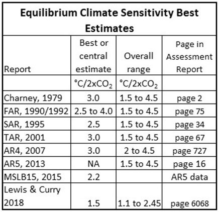 Sie liefern auch einen wahrscheinlichen Wert von 2,4°C auf Seite 9, obwohl sie auf Seite 2 einen Wert „nahe 3,0“ angeben. Der Wert auf Seite 9 ist nicht weit entfernt von der empirischen Schätzung von 2°C von Guy Callendar aus dem Jahr 1938, aber deutlich höher als der von Nic Lewis und Judith Curry (Lewis & Curry, 2018) angegebene Wert von 1,2°C bis 1,95°C (Bereich von 17% bis 83%, best estmate 1,5°C).