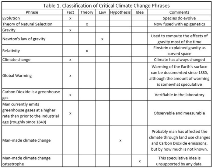 Tabelle 1 unten enthält Phrasen. Jede wird als Fakt, Theorie, Gesetz, Hypothese oder einfach als Idee identifiziert. Wir sehen, dass der anthropogene Klimawandel und die Möglichkeit einer anthropogenen Klimakatastrophe nicht mit den Relativitäts- und Evolutionstheorien vergleichbar sind. Der anthropogene Klimawandel ist mehr als eine Idee, er beruht auf einigen Beobachtungen und vernünftigen Modellen des Prozesses. Aber keines der Klimamodelle hat die globale Erwärmung erfolgreich und genau vorhergesagt. Die Relativitäts- und Evolutionstheorien dagegen haben jeweils erfolgreiche Vorhersagen mit großer Genauigkeit und Präzision gemacht.