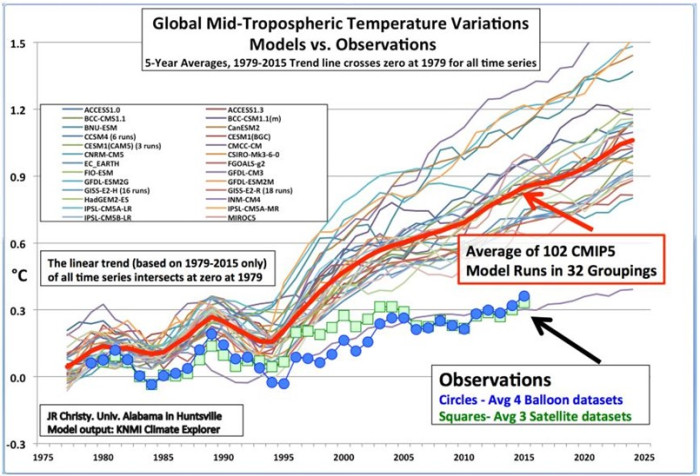 Abbildung 1: Ein Vergleich von IPCC-CMIP5-Klimamodell-Prognosen mit drei Datensätzen von Satellitenbeobachtungen und 4 Datensätzen von Ballon-Messungen. Die Graphik präsentierte John Christy im Jahre 2016 dem Committee on Science, Space and Technology des Weißen Hauses (Christy 2016)