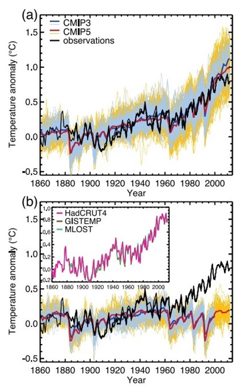 In Abbildung 3, Schaubild (a), verwenden die Modelle ein Szenario, das nach Ansicht des IPCC sowohl die natürlichen als auch die menschlichen Klimaeinflüsse widerspiegelt. In Schaubild (b) verwenden sie ein Modellszenario, von dem sie glauben, dass es nur natürliche (d.h. nicht-menschliche) Klimaeinflüsse repräsentiert.
