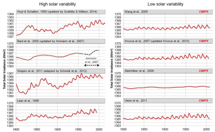 Abbildung 4. Verschiedene begutachtete Modelle der Sonnenvariabilität der letzten 200 Jahre. Das IPCC verwendet Sonnenmodelle mit geringer Variabilität wie die rechts abgebildeten, um die natürliche Variabilität zu berechnen, damit sie den menschlichen Einfluss ableiten können, wie in Abbildung 3 dargestellt. Quelle: (Bald, Connolly, & Connolly, 2015).