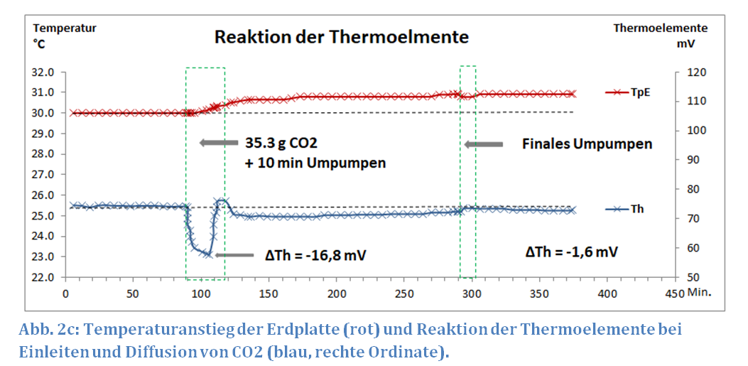 Unmittelbar nach dem Einleiten und Umpumpen, befindet sich das CO2 im Bereich des Tp4-Sensors bei rund 12 °C, also 18 K kälter als die Erd-Platte (siehe Abb. 2b). Trotzdem reagiert die weit entfernte Erd-Platte nur wenige Minuten nach Beginn der CO2-Einleitung mit einem deutlichen Temperatur-Anstieg. Diese CO2-Schicht dehnt sich langsam durch Diffusion in der gesamten Apparatur aus, wobei immer wärmere Regionen erreicht werden. Die Erd-Platte reagiert hierauf mit einem kontinuierlichen Temperatur-Anstieg, der bei 290 Minuten ein Maximum von ∆TpE = 0,9 K erreicht. Auch ein weiteres 10-minütiges finales Umpumpen verändert diesen Wert nicht mehr.
