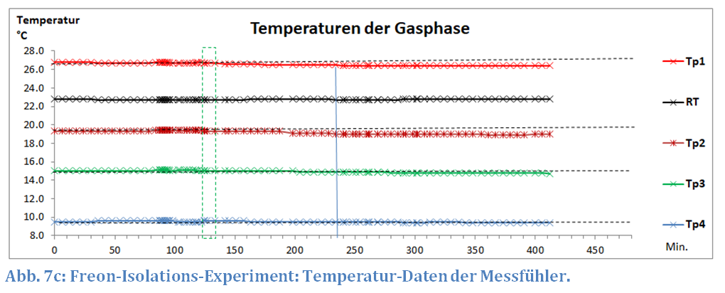 Bis zur 235. Minute sieht der Versuch Freon Nr. 15 wie eine Wiederholung des Freon-Experimentes Nr. 13 aus (siehe Abb. 7a bis 7c). Aber es gibt einen Unterschied: Die kalte Platte ist rund 10 K kälter als beim vorherigen Experiment. Trotz der geringeren Temperatur der kalten Platte (TpK = -11.4 ° vs. TpK = -1,8 °C) ist der Temperatur-Anstieg ∆TpE der Erd-Platte um 0,55 K größer als beim Experiment 13 (∆TpE = 1,69 vs. ∆TpE = 1,17 K).
