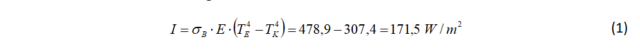 Für E=1 (Emissionsaustauschgrad), TE = 303,15 K (30 °C) und TK = 271,35 K (1,8 °C) errechnet sich eine Intensität I für den Strahlungsaustausch mit B als Boltzmann-Konstante: