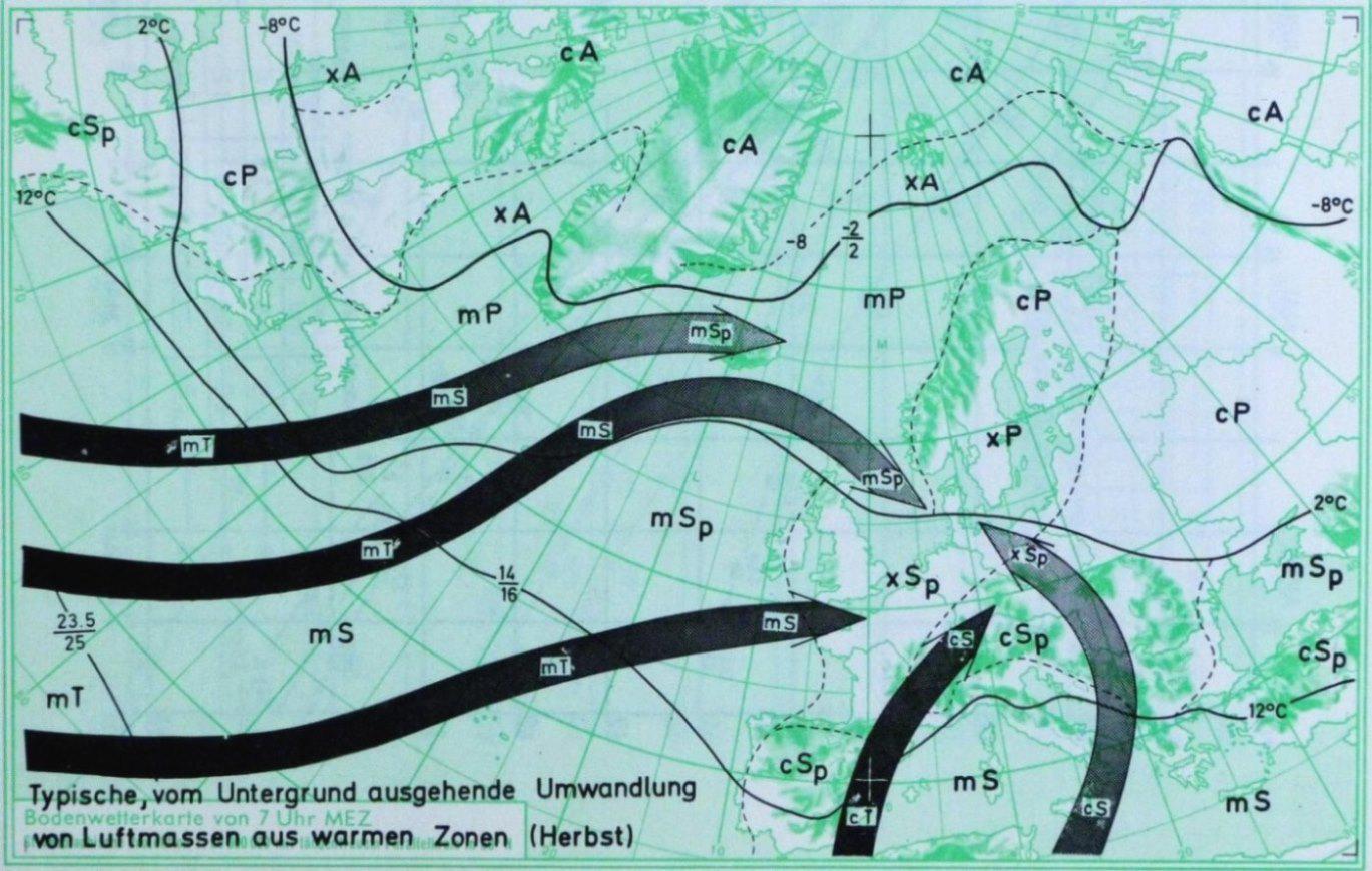 Das Ganze erinnert an den „Klimasprung“ Ende der 1980er/Anfang der 1990er Jahre mit mehr und intensiverer Besonnung; worauf im Teil 2 noch näher eingegangen wird. Luftmassen können labil oder stabil geschichtet sein. Ersteres begünstigt die Durchmischung der Luft (Thermik) und kann bei genügend Wasserdampfgehalt zu Schauern und Gewittern führen; Letzteres geht oft mit einer Temperaturzunahme nach oben und Flaute am Boden einher; was sich nicht selten an Dunst, Nebel und Hochnebel erkennen lässt. Im Winter kann diese stabile Schichtung in Bodennähe eine ganz andere Luftmasse vortäuschen, als reell vorhanden; das ist bei der Luftmassenbestimmung unbedingt zu beachten: