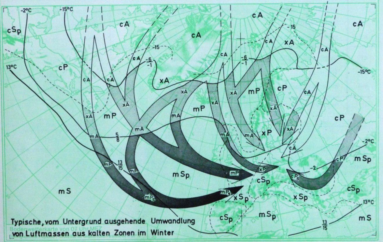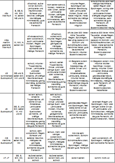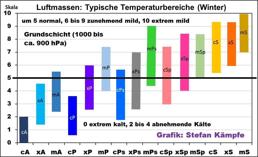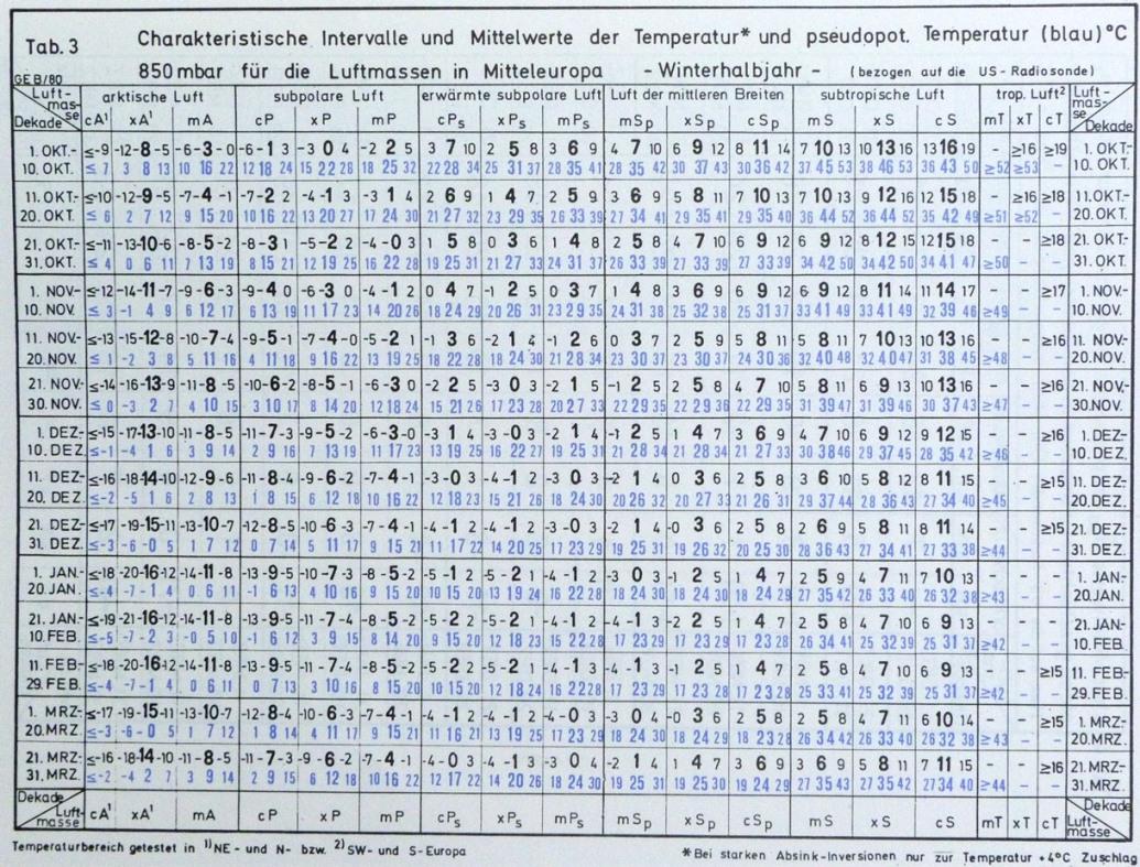 Zur Klassifikation der Luftmassen nach ihrer Temperatur und ihrer pseudopotentiellen Temperatur wurden vom Meteorologischen Institut der FU Berlin Tabellen entwickelt; hier sei das für das 850 hPa-Niveau im Winterhalbjahr gezeigt (entspricht in etwa 1500 Metern Höhe):